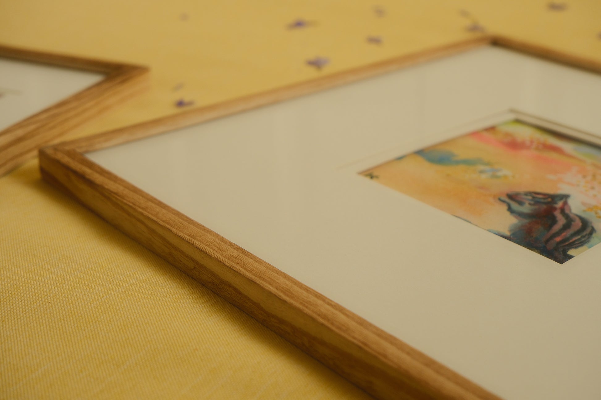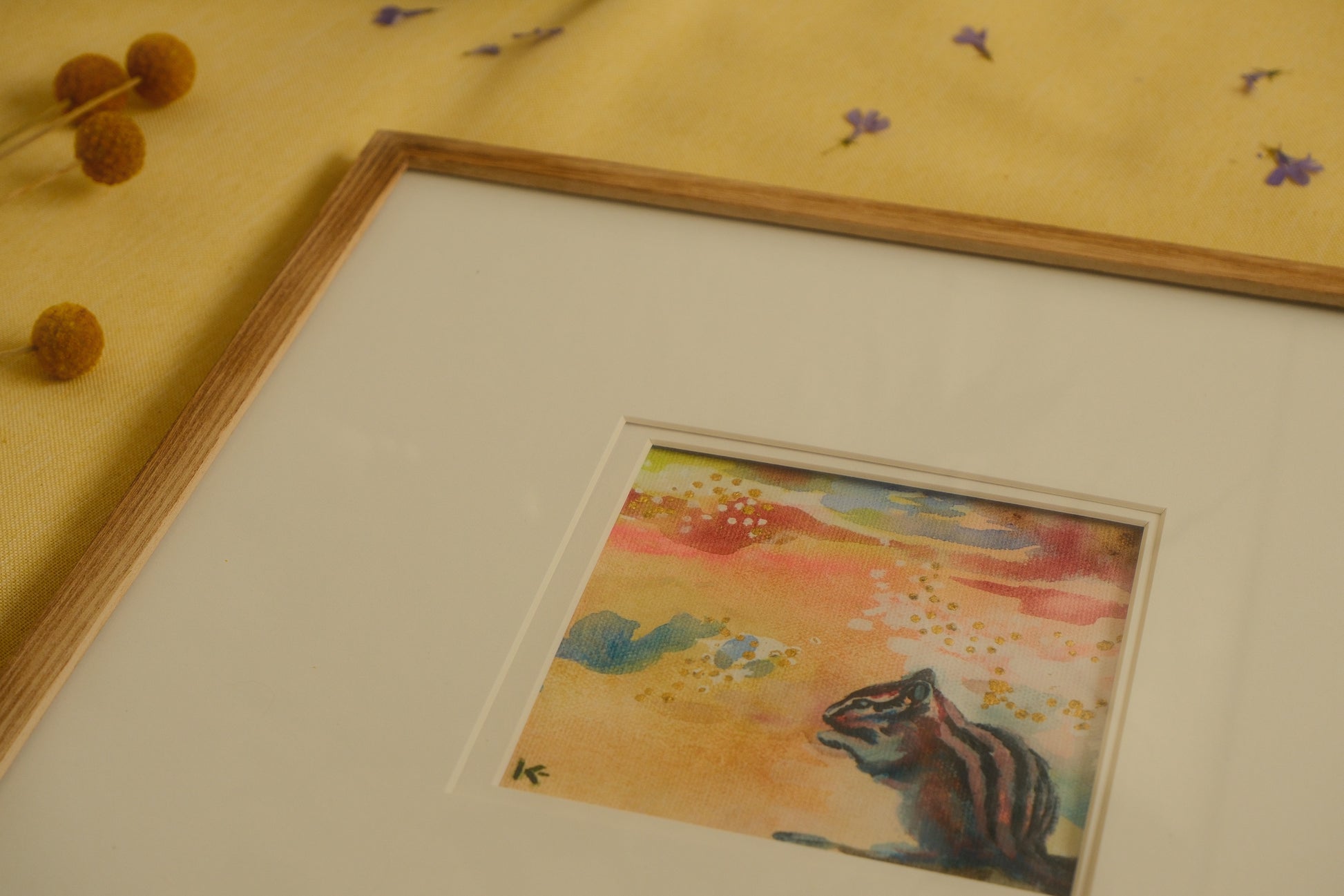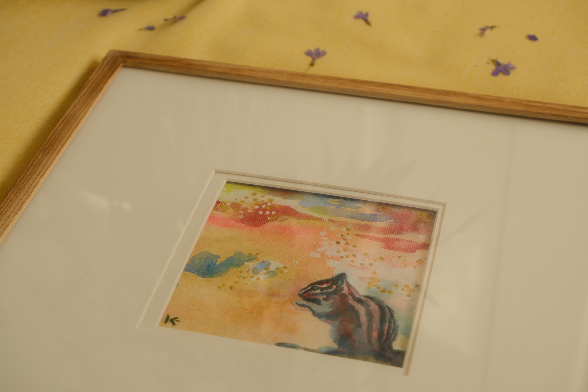 'Down to Earth' was created using acrylics and gold leaf on 5" by 5" unstretched canvas (matted to 5" by 5" and framed in a 12" by 12" solid wood frame).
